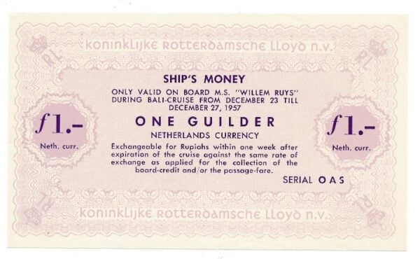 Scheepsgeld was geïntroduceerd omdat het destijds verboden was om Nederlands geld uit te voeren. Dit biljet was geldig aan boord van het schip “De Willem Ruys”. Deze waardebonnen konden tijdens de reis worden uitgegeven aan boord van het schip waarvoor ze gedrukt waren, of worden omgewisseld binnen een bepaalde termijn na aankomst op de eindbestemming. De tegoedbonnen zijn in 2 kleuren gedrukt en zijn enkelzijdig. Dit biljet is in UNC staat.