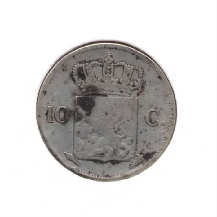 一角钱的 koning Willem 1, geslagen tussen 1818 en 1829, is onderdeel van de Nederlandse muntgeschiedenis van de negentiende eeuw. Deze munt is gemaakt van 569/1000 zilver, heeft een diameter van 18 millimeter en weegt 1,69 gram. Op de voorzijde staat de grote ‘W’ van Koning Willem I samen met het jaartal. Omdat België in het begin van de negentiende eeuw nog onderdeel van Nederland was, zijn de dubbeltjes zowel in Utrecht als in Brussel geslagen De keerzijde toont de waarde aanduiding “10 C”. Naast de 10 cent zijn er ook nog de volgende munten bij de serie: