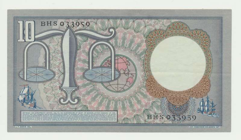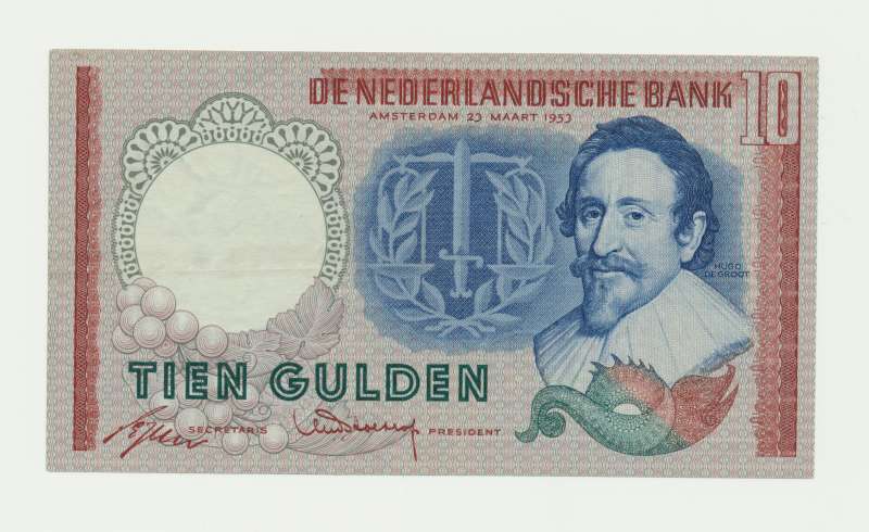 以雨果-德-格鲁特(Hugo de Groot)为主题的 10 盾纸币是 Eppo Doeve 于 20 世纪 50 年代初开始发行的第一个传统系列的一部分。正面是雨果-德-格鲁特(荷兰著名哲学家)的形象,背面是天平、地球仪和两艘船,象征荷兰的海外贸易。水印中可见鸽子群,这种纸币有两个变体,都有荷兰国家银行行长霍尔特罗普和荷兰国家银行秘书德容的签名: