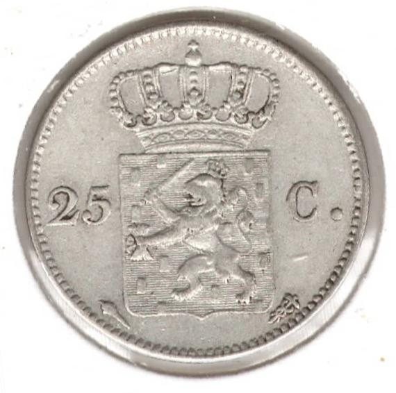 季度 koning Willem 1, geslagen tussen 1818 en 1830, is onderdeel van de Nederlandse muntgeschiedenis van de negentiende eeuw. Deze munt is gemaakt van 569/1000 zilver, heeft een diameter van 20,6 millimeter en weegt 4,23 gram. Op de voorzijde staat de grote ‘W’ van Koning Willem I samen met het jaartal. Omdat België in het begin van de negentiende eeuw nog onderdeel van Nederland was, zijn de kwartjes zowel in Utrecht als in Brussel geslagen De keerzijde toont de waarde aanduiding “25 C”. Naast de 25 cent zijn er ook nog de volgende munten bij de serie: