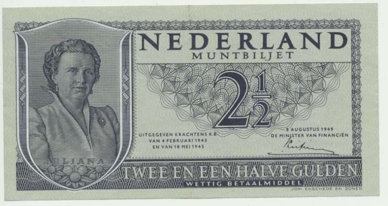 货币清洗之后,所有纸币都被新货币取代,只是由于银币稀缺,仍无法铸造新的银币。因此,在 朱莉安娜王后 新设计的纸币取代了以威廉明娜为图案的旧纸币。作为该系列的一部分,还设计了印有朱莉安娜的 2.5 盾纸币。新纸币的图案是新女王的形象,周围有两个字母 "J",代表朱莉安娜。新钞由财政大臣彼得-利夫廷克(Pieter Lieftinck)签署,他也是 1945 年 7 月和 9 月现金大清洗的负责人。除了 2.5 盾外,还有"......":