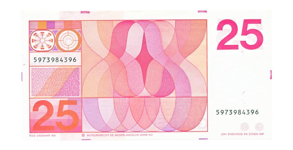 25 盾纸币于 1971 年推出,上面印有作曲家 Jan Pieterszoon Sweelinck 的肖像。它取代了 20 世纪 50 年代的克里斯蒂安-惠更斯(Christiaan Huygens)肖像。带有 Sweelinck 图样的 25 盾纸币正面和背面都有彩色的玑镂花纹,因此深受纸币收藏者的喜爱。带有 Sweelinck 的 25 盾纸币是 Oxenaar 传家宝系列的一部分,除黄色外,还有