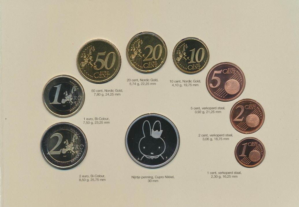 荷兰米菲 2005 年欧元硬币套装包含 1 分至 2 欧元的 BU 质量。套装中包括一个米菲的铜镍纪念品。为纪念米菲 50 周年而制作。