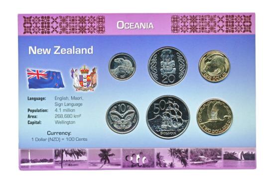 Nieuw-Zeeland Muntset Dollar/Cents Uit de serie ‘Coins of the World. Op wereldreis met de Koninklijke Nederlandse Munt,’ subserie ‘Oceanië’. Uitgegeven door de KNM. 硬币的年份可能有所不同。